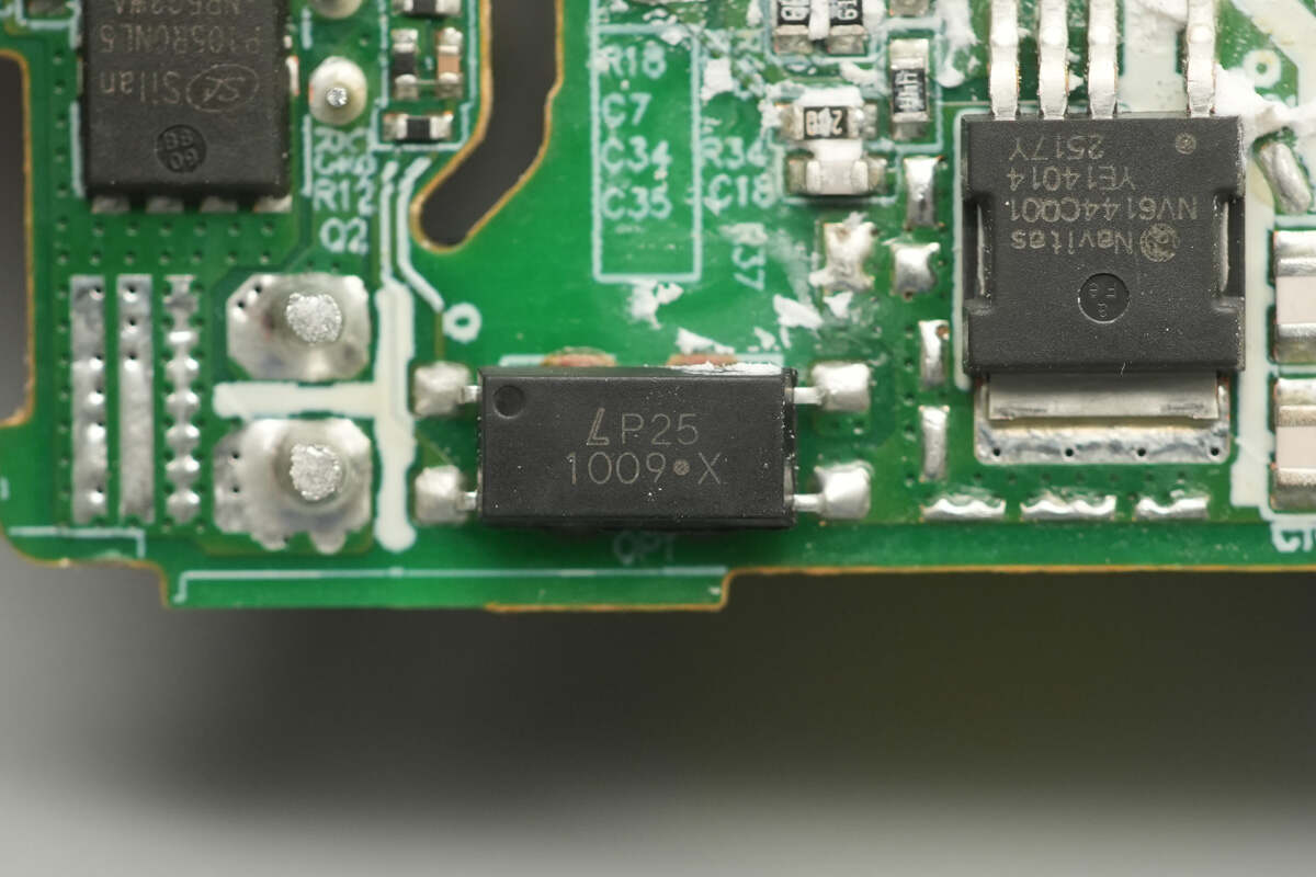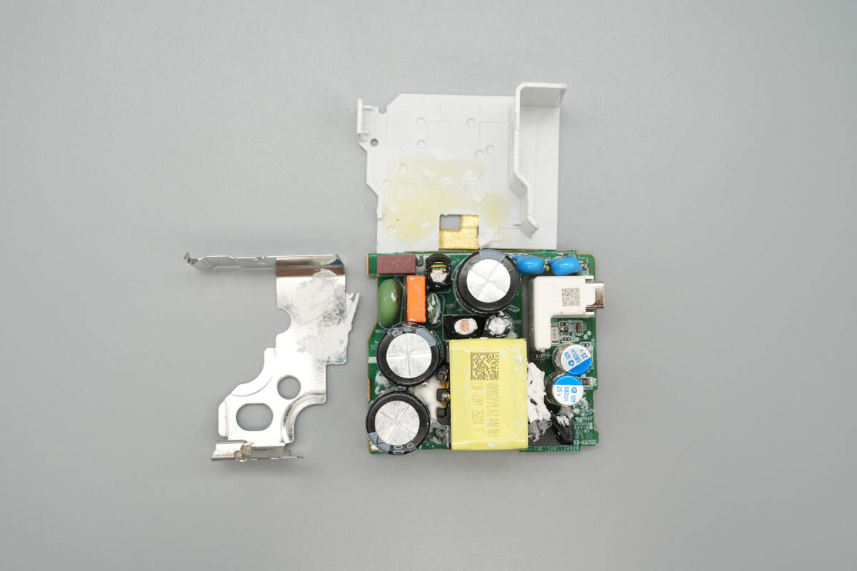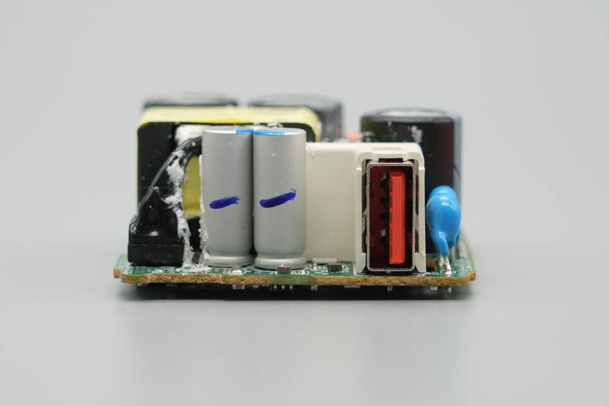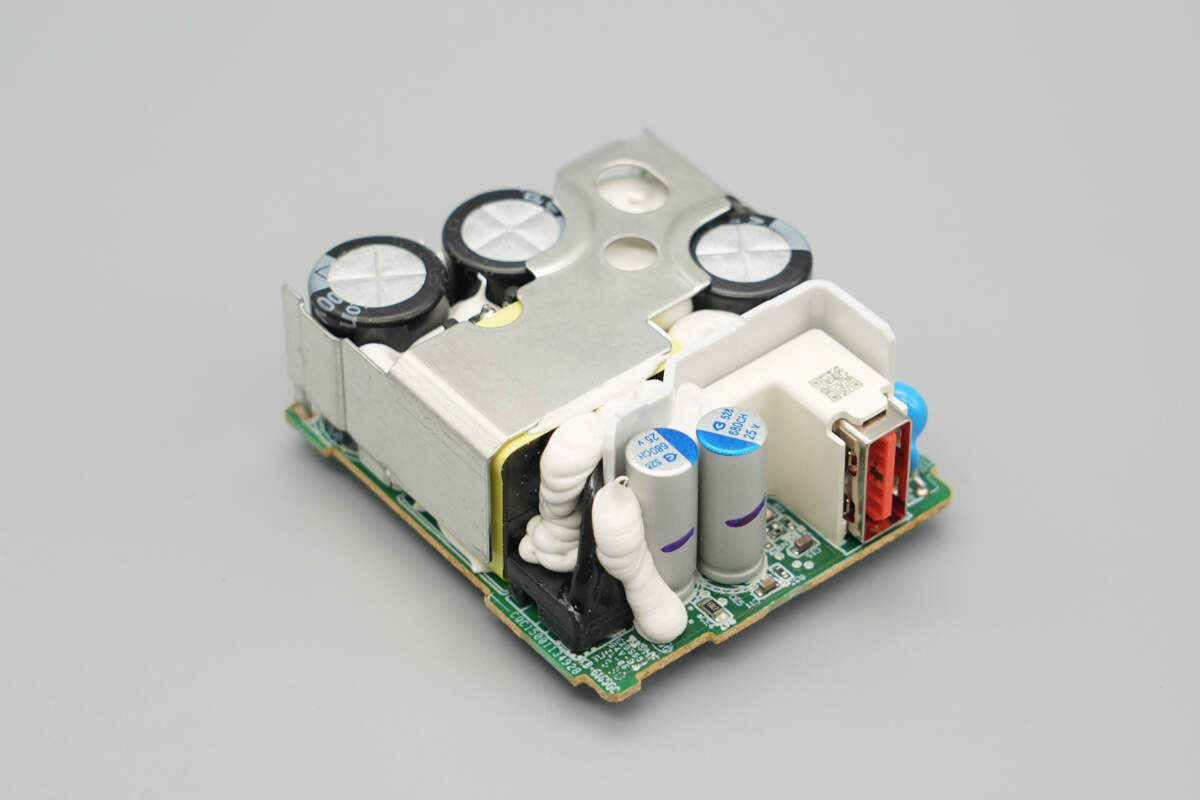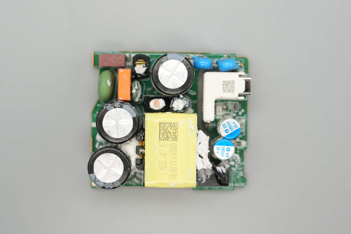 On the back side, there are four rectifiers, the primary control IC, a synchronous rectifier controller, a synchronous rectifier, a protocol chip, and a VBUS MOSFET.