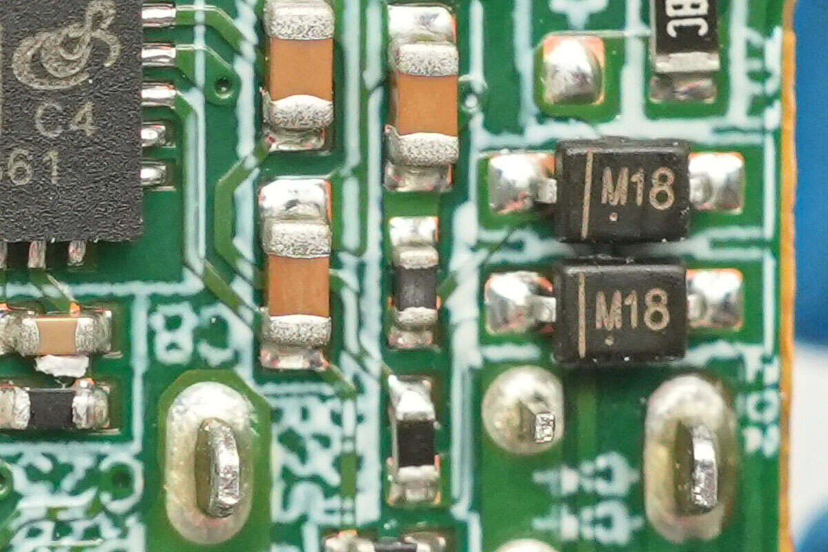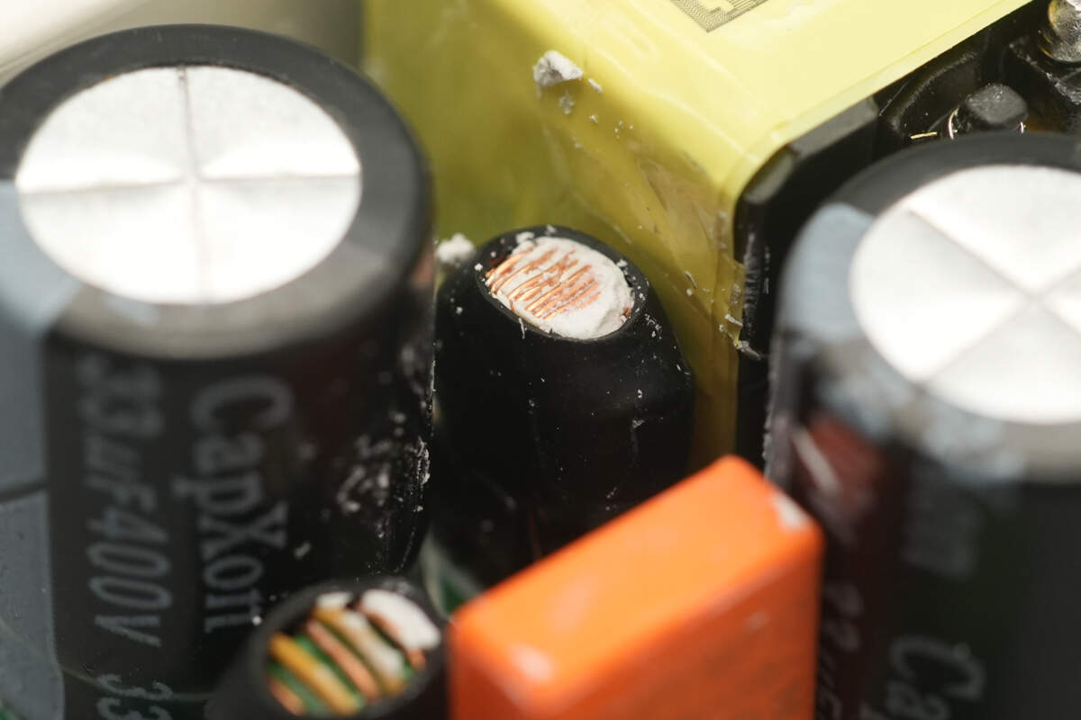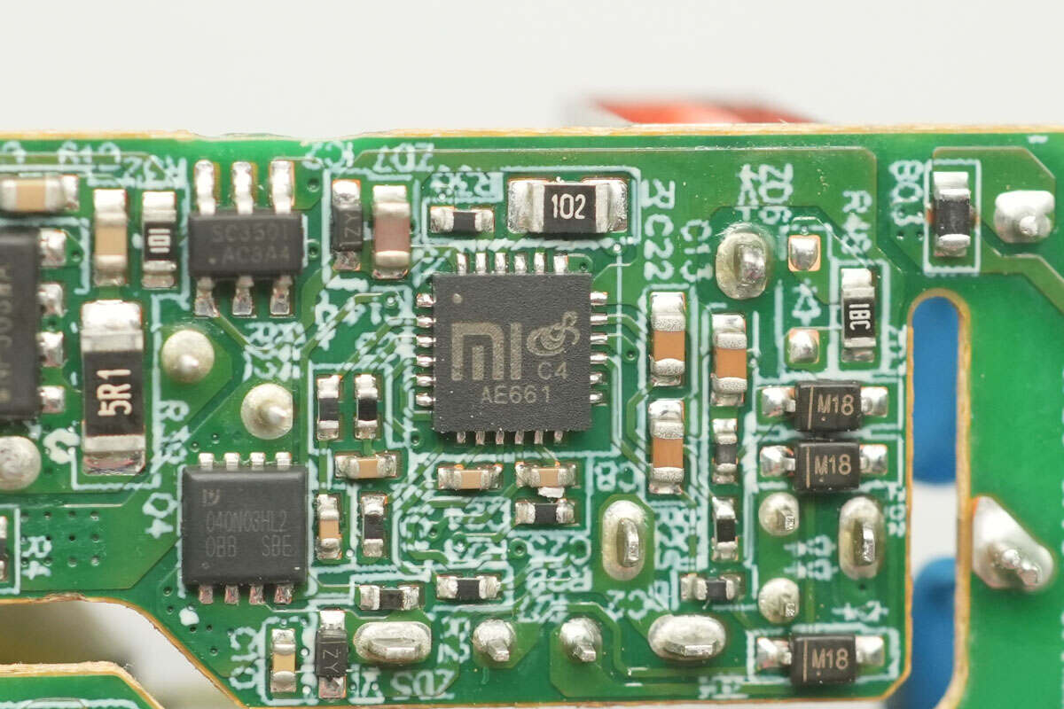 An NTC thermistor is located on the right side of the protocol chip to monitor the internal temperature of the charger and provide overtemperature protection.