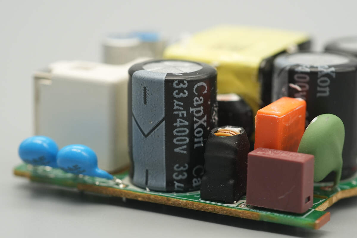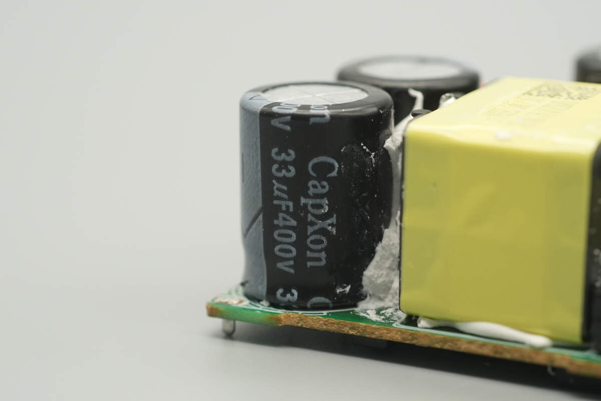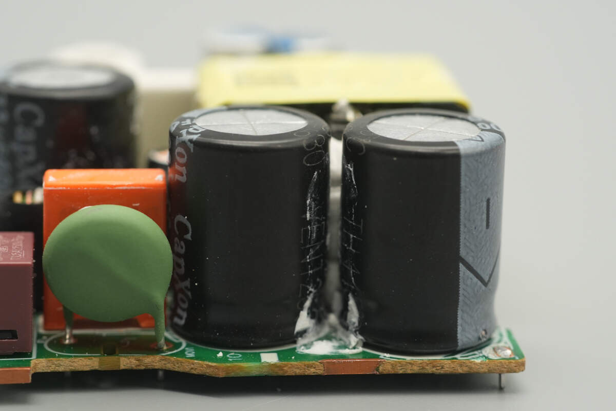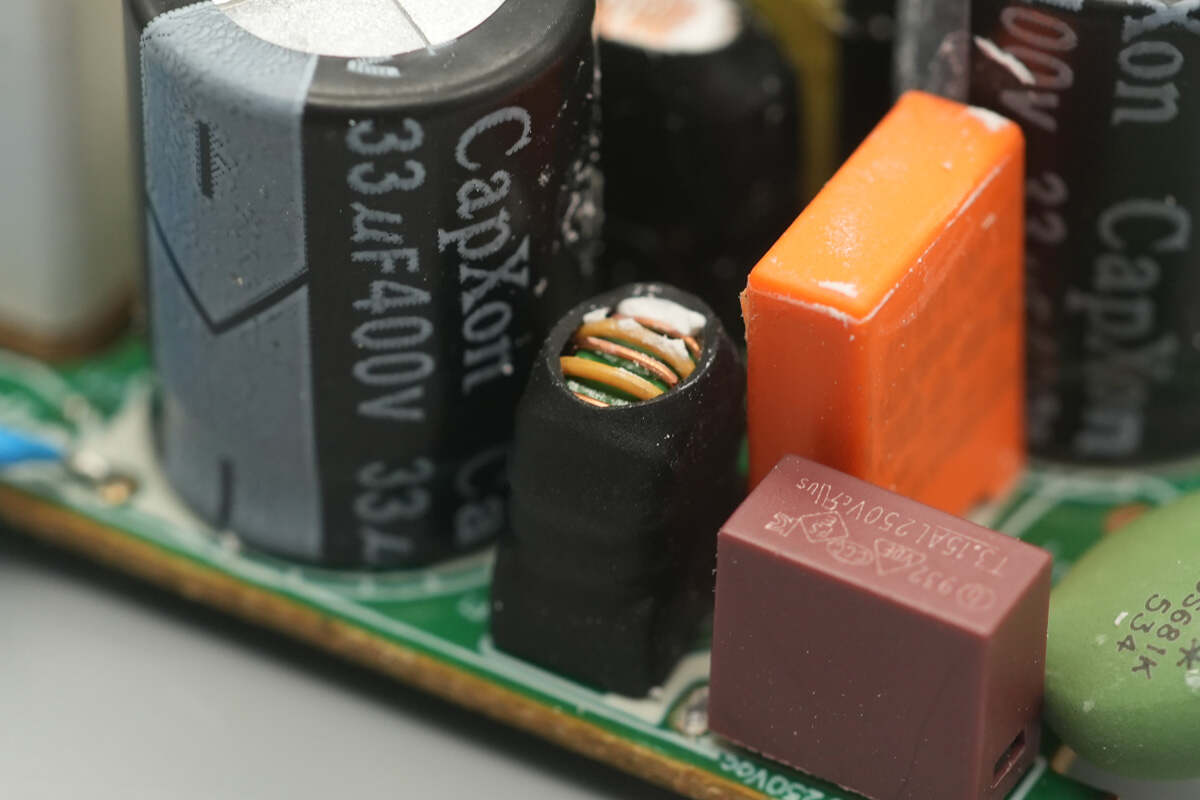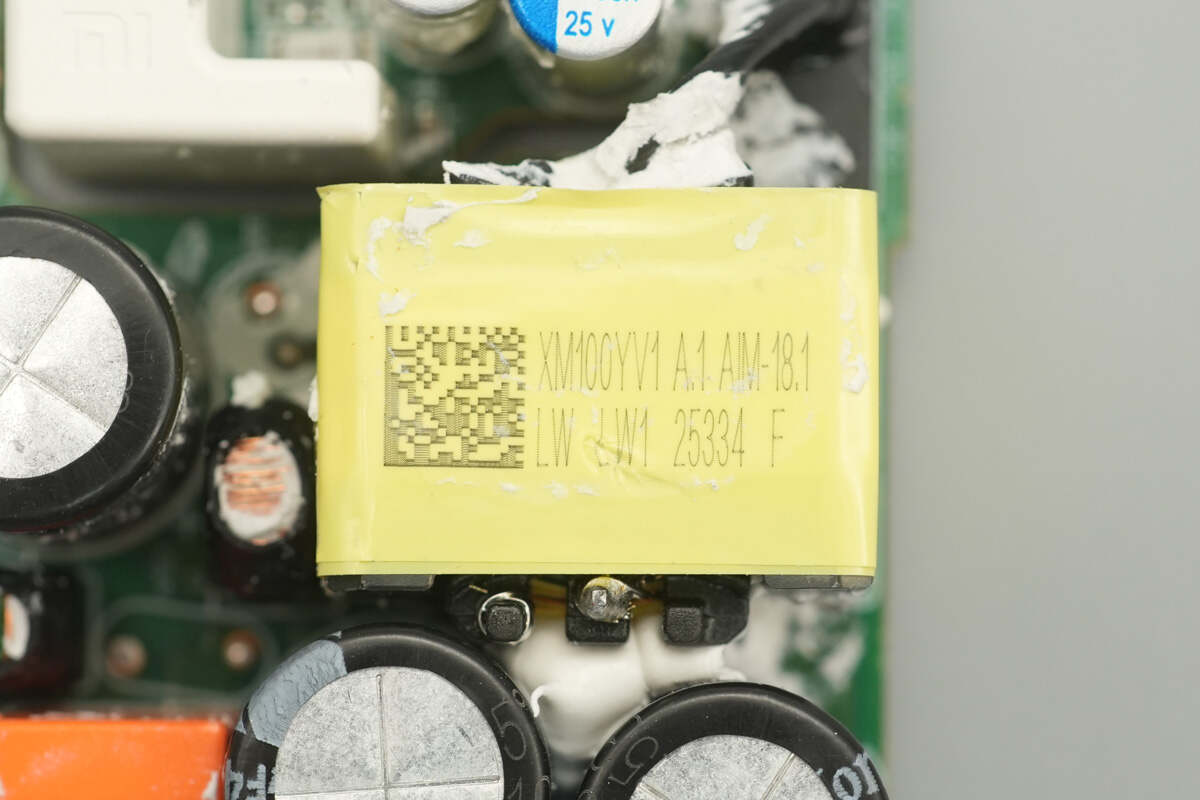 The front side of the PCBA module contains a fuse, varistor, safety X2 capacitor, common mode choke, thermistor, capacitors, filter inductor, transformer, and blue Y capacitors.