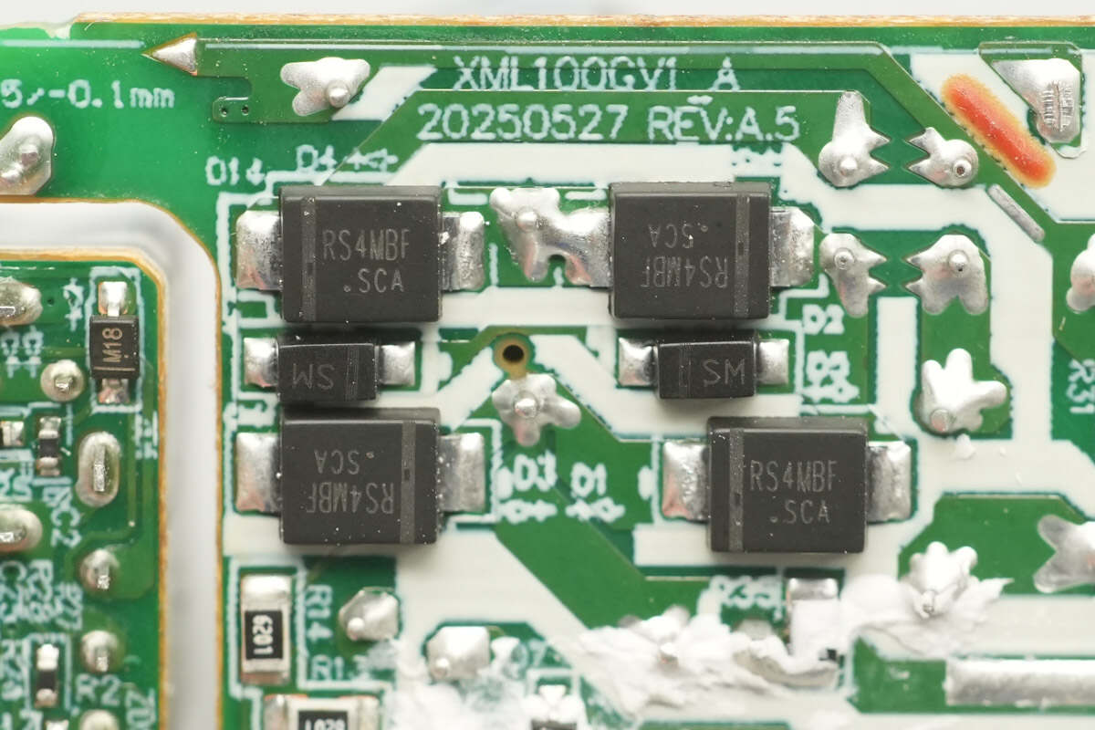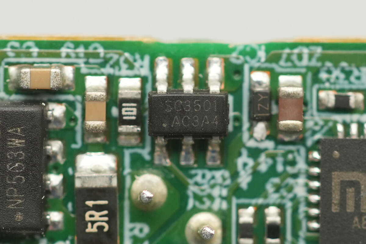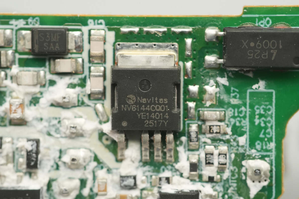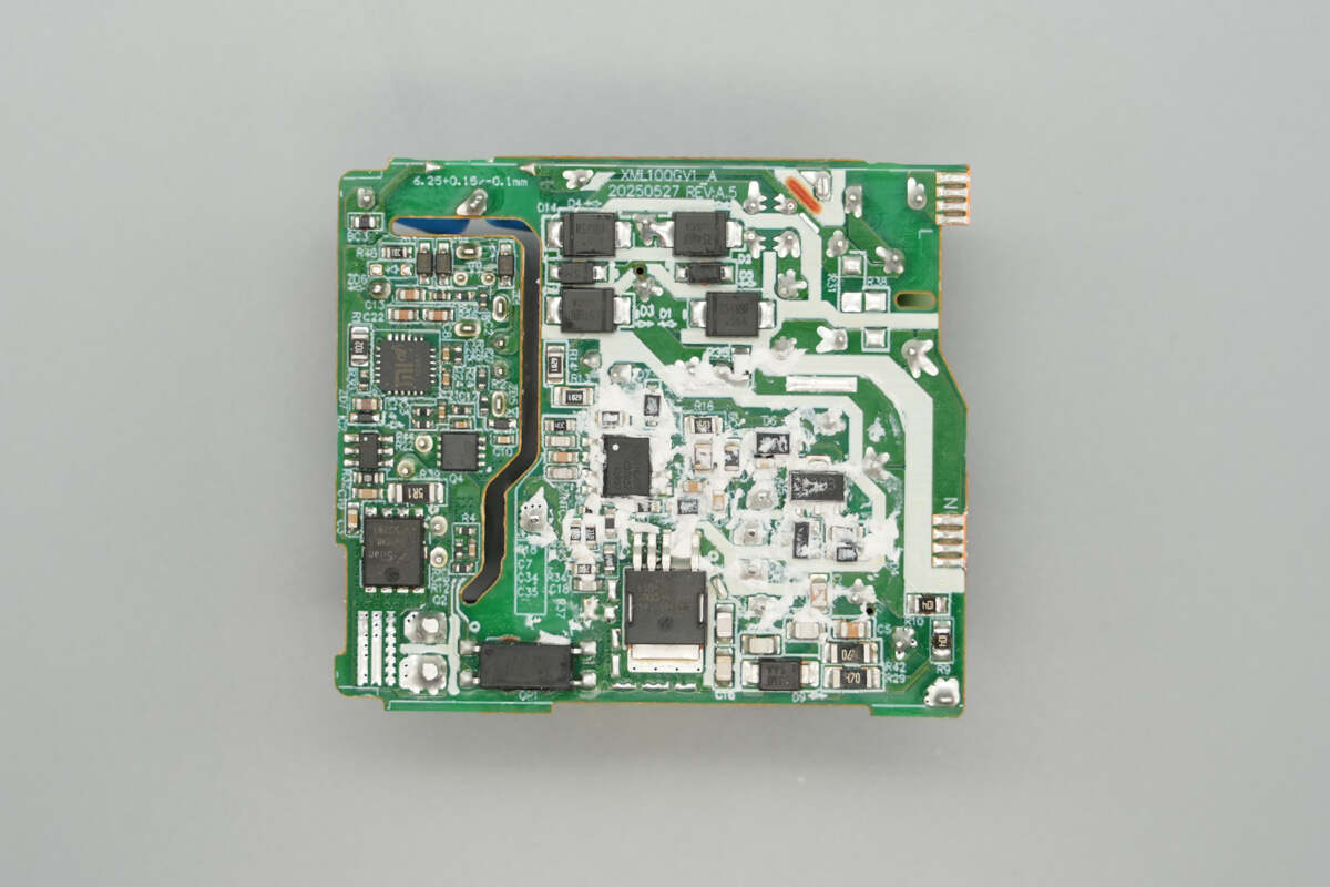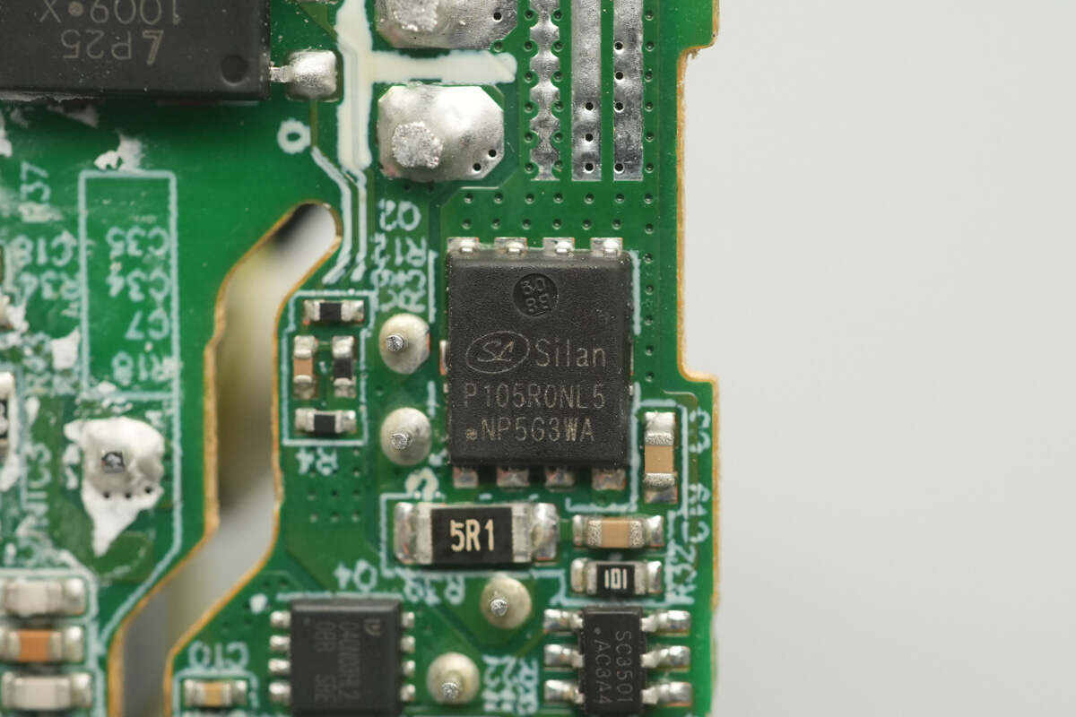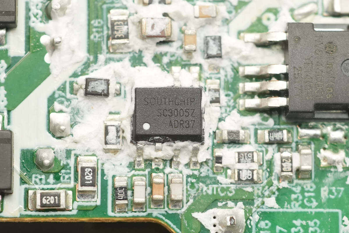 After taking it apart, we found that it uses a SouthChip solution, featuring the SC3005Z primary control IC paired with an SC3501 synchronous rectifier controller, and a protocol chip marked “C4.” The primary MOSFET is a Navitas NV6144C, paired with a Silan synchronous rectifier.