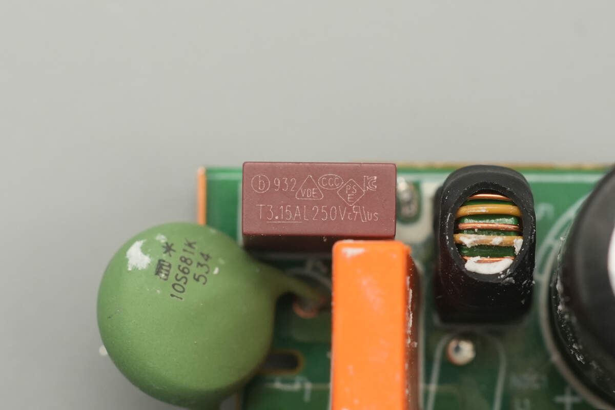 The input fuse is from Betterfuse, part number 932, rated at 3.15 A, 250 V.
