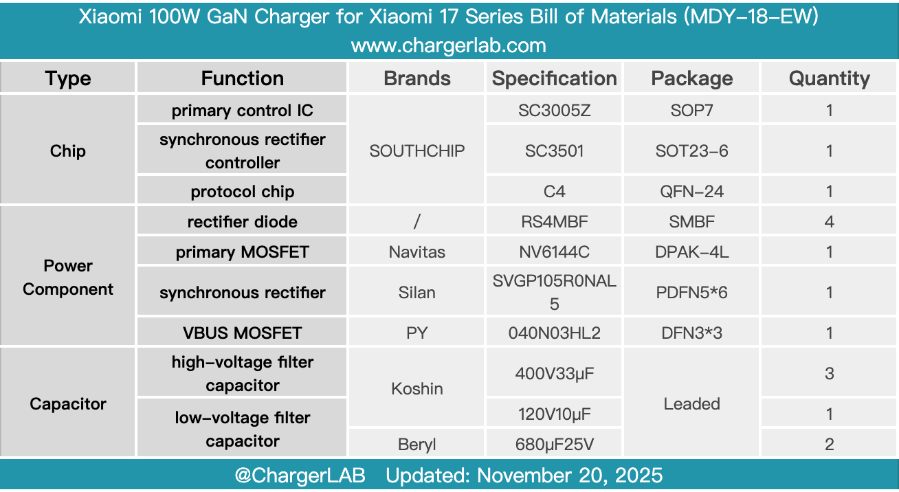 Here is the component list of the Xiaomi 100W GaN Charger for Xiaomi 17 Series for your convenience.