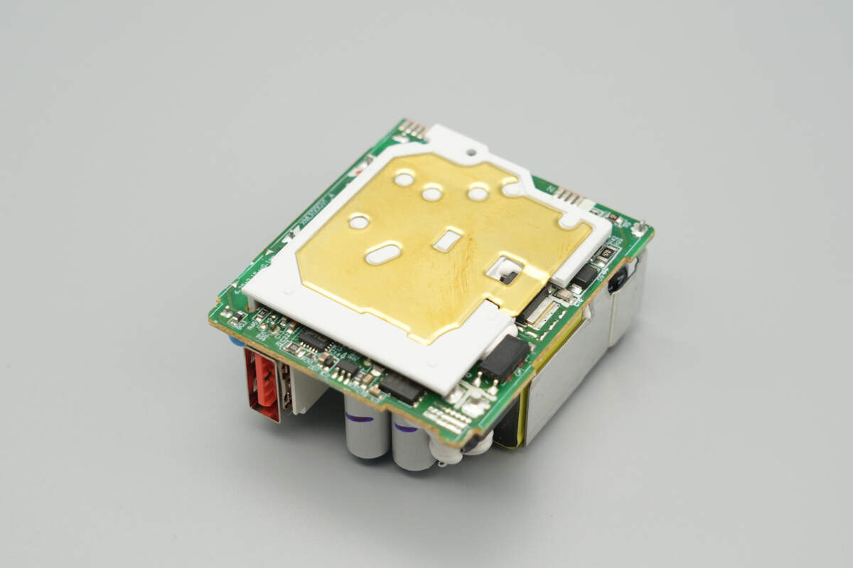 The front side of the PCBA module features a heatsink, and an isolation plate is placed between the transformer and the low-voltage components.